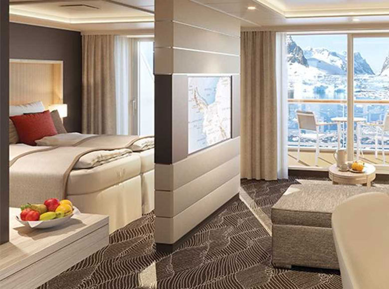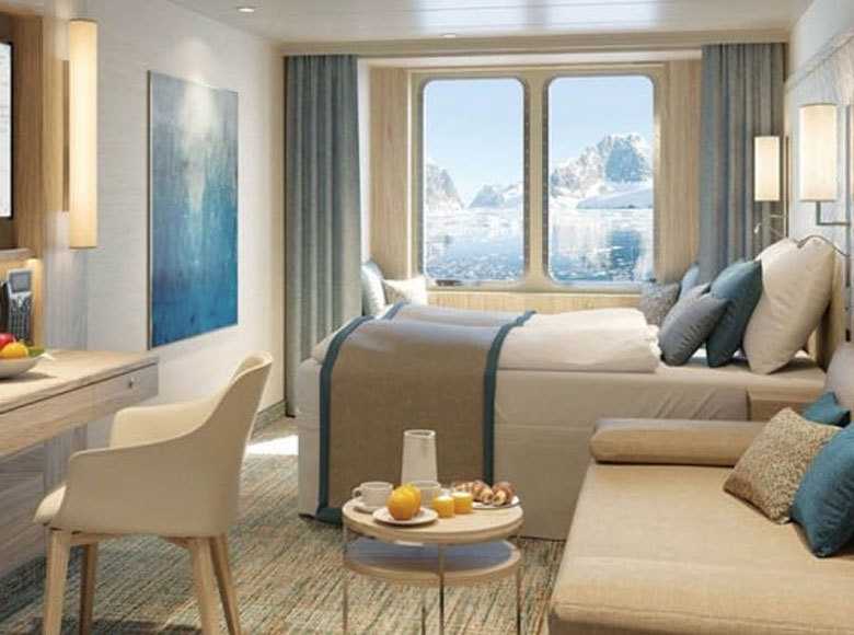 All cabins are outward-facing and feature large windows. All are equipped with climate control, an expedition command center—including tablets, multiple electrical and USB outlets, a TV, barometer, a National Geographic Atlas, and more—a mini refrigerator, small safe, and robes. Bathrooms are outfitted with a rain shower and directional showerhead, botanically inspired products, and a hair dryer. Enjoy luxury linens and pillows, as well as complimentary insulated water bottles.  #608, 610, 612, 613-623 — Suite with balcony that features two balcony chairs and a table; two single beds that can convert to a queen, convertible sleeper sofa, coffee table, writing desk with chair, hammock, two bedside tables, and a closet.