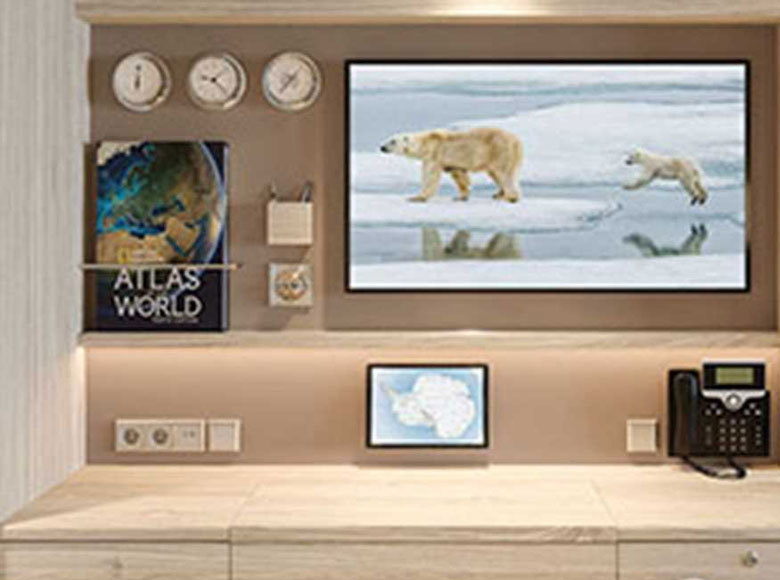 All cabins are outward-facing and feature large windows. All are equipped with climate control, an expedition command center—including tablets, multiple electrical and USB outlets, a TV, barometer, a National Geographic Atlas, and more—a mini refrigerator, small safe, and robes. Bathrooms are outfitted with a rain shower and directional showerhead, botanically inspired products, and a hair dryer. Enjoy luxury linens and pillows, as well as complimentary insulated water bottles. #700-707, 712, 714-717 — Large Balcony Suite that features two balcony chairs, hammock, and a table; two single beds that convert to a queen. Large Suite sized bathroom with double vanity, bathtub, towel warmer, rain shower, separate bathroom with toilet. Sofa bed, coffee table, writing desk and chair, hammock, and a large walk-in closet with full length mirror. Suites include a Bose Bluetooth player.