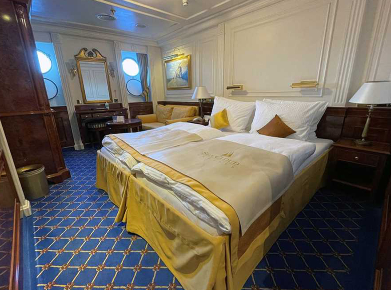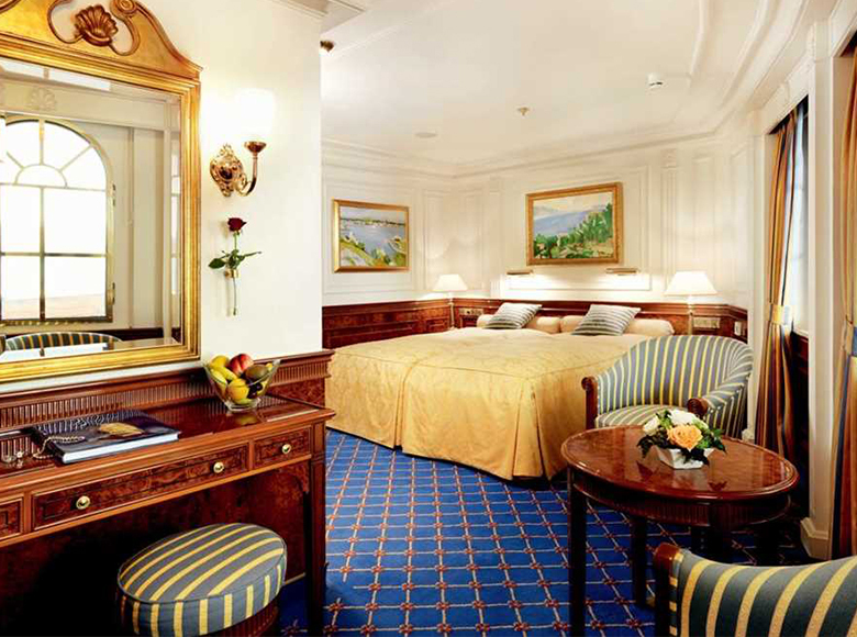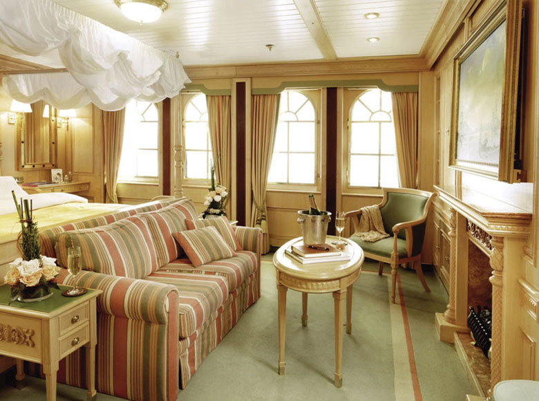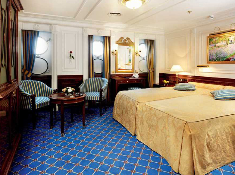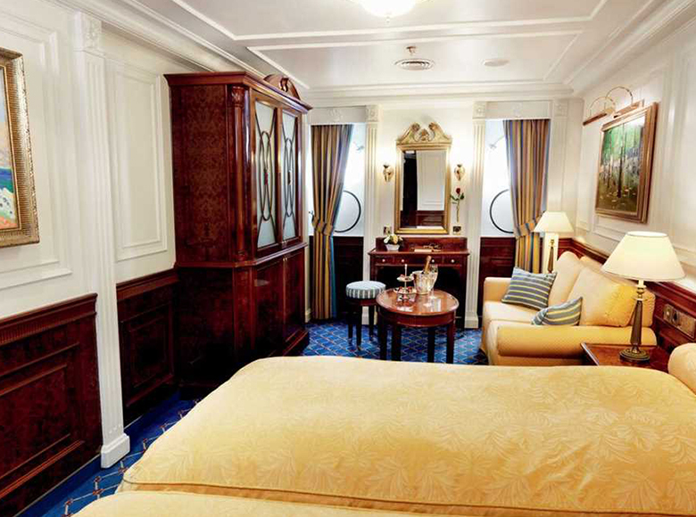 The main deck cabins have antique and period-style furniture. These are the ship's original cabins, including the owner’s suites originally occupied by E.F. Hutton and Marjorie Merriweather Post. Cabins on the promenade and captain’s decks have modern, stylish, comfortable furniture.