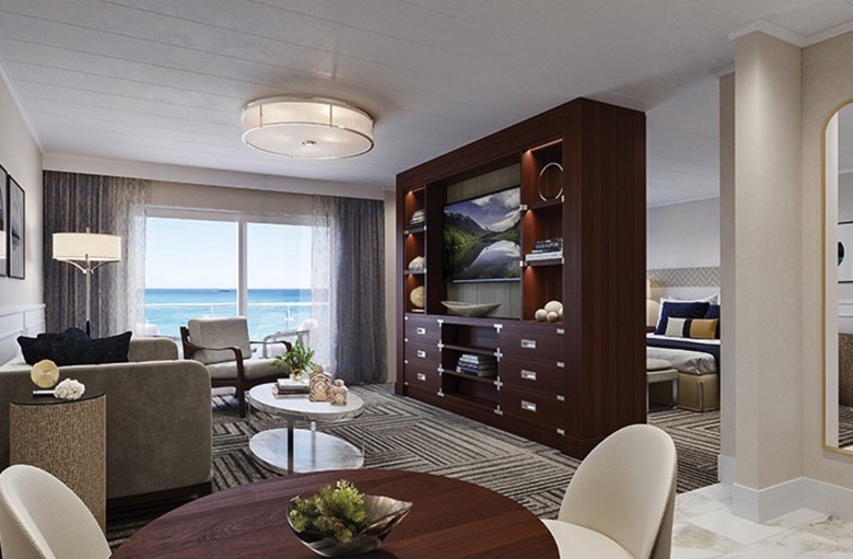 The luxurious Grand Suite measures an outstanding 650 sq. ft. and offers panoramic views with floor-to-ceiling glass windows. Be treated to a fruit and cheese plate when you arrive and cheers with a complimentary bottle of premium champagne as you begin your adventure. Through sliding glass doors visit your private balcony complete with a sitting area, the perfect place to enjoy breakfast room service or watch the sun set. Each Grand Suite features a lavish bedroom and a separate living room ideal for gathering with family and friends after an invigorating day of exploration. All Grand suites include double sinks in the bathroom complete with plush robes for your comfort. Your in-suite mini-refrigerator will be fully stocked and replenished throughout the week with juices, waters, white and red wine. Enjoy “suite treats” delivered each evening.