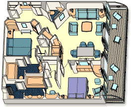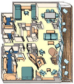 Unparalleled luxury and personal attention combine in our very finest type of suite and our most spacious quarters. Concierge Royal Suites with Verandah are classified as Category 01A and are located on Deck 8, Midship.A sophisticated art deco décor incorporates original artwork, vintage Disney hallmarks, warm wood finishes with inlaid details, elegant furnishings and lavish marble-and-granite bathrooms to take your cruise to superlative new heights.Guests of our Royal Suites have at their disposal:2 separate bedrooms2.5 bathrooms, including a main with a whirlpool tubA verandahLiving roomOpen dining salonPantry and wet bar stocked with water and sodasWalk-in closetMedia library accessSpecificationsSleeps: 7Size: 1,029 sq. ft., including verandahRoom Configuration: 2 bedrooms: main with king bed, second with 2 single beds and 2 pull-down upper berths; wall pull-down bed in living roomView: private verandah with floor-to-ceiling windowsAmenitiesCustom Premium Plush Euro-top mattressFrette® 1000-thread-count, 100% cotton linensPremium Frette® bath towels4 high-definition LCD flat-screen TVs (located in main bedroom, second bedroom, living room and media room)RefrigeratorIn-room safeHair dryerPhone with voicemail messagingIndividual climate controlCouch, desk and chairDining tableElemis® Body Exotics bath, shower and spa productsUpgraded AmenitiesWhile all Disney Cruise Line staterooms boast luxury amenities and world-class service, Guests of our Concierge Suites enjoy an expanded range of offerings:Down Duvets: Enjoy a superlative night’s sleep with the softness of genuine feather duvets, featured in Concierge main bedrooms.Guests of our Concierge Suites may choose from pillow options including hypoallergenic, feather and therapeutic memory foam.Personal Robe and Slippers: These plush comforts are yours to use for the duration of your cruise.Complimentary Wi-Fi Internet Service: Enjoy the Premium Surf Wi-Fi package for each Guest in the suite for the length of the voyage at no extra charge.VerandahEvery Concierge Suite includes a private verandah, affording Guests sweeping ocean views and bracing sea breezes. Bask in the sunshine, enjoy leisurely conversations, coffee or cocktails, or simply admire the scenery as it floats by.Your verandah features:Patio furnitureDeck lightingPlexiglas® railings and dividersChildproof locksExpanded Main Suite OptionFor larger parties, add an adjoining 1-Bedroom Suite with Verandah. On adjoining accommodations, the partition between verandahs can be opened to create a larger balcony for sharing, with access between rooms.Pre-Arrival ServicesOur signature Concierge services begin before you board the ship and continue throughout your vacation and beyond. Pre-reserve many of your onboard activities and services online, up to 120 days prior to your sail date. You may also inform the Concierge Team of your preferences 130 days prior to sailing, and they will make the bookings on your behalf when the 120-day booking window opens. Requests will be processed in the order in which they are received.A dedicated Concierge Agent is available Monday through Saturday, 8:30 AM to 5:30 PM. Call (866) 784-1654 for personalized assistance in planning every cruise detail, including:Port AdventuresReservations for Palo, spa treatments or nursery staysDining room seating requestsSpecial occasions and celebrationsAny other special requests, from pre-arrival to post-cruisePlease note that requests are confirmed at time of booking and cannot be guaranteed. Guests under 18 years of age must have parent or guardian permission to call. All experiences are subject to availability and may be subject to capacity restraints.Shipboard ServicesDuring your cruise, the benefits of signature Concierge service begin with priority check-in and boarding at a dedicated check-in station. Our onboard Concierge team will meet you at a private welcome reception—exclusive to Concierge Guests—and will be available to attend to your needs, questions and special requests. Enjoy assistance with:Reservations (Port Adventures, Palo dining, spa treatments and nursery stays)In-suite dining from our concierge in-suite dining menuDining reservation confirmations and changesPriority tendering in ports of callUpdates to your personal itinerarySpecial occasions and celebration planningExclusively for Concierge GuestsAs a Concierge Guest, you’ll enjoy exclusive access to dedicated areas on the ship, including the Concierge Lounge. Located amid the Concierge Suites on Deck 10, this stylish, modern retreat allows Guests to relax in quiet comfort, sip a cocktail (during select hours), access the Internet (fees may apply), watch news on a large-screen TV, and enjoy complimentary food and nonalcoholic beverages offered throughout the day.From the Lounge, Concierge Guests can access a sun deck via a private entrance. Soak up the sun at this VIP onboard oasis and savor tranquil breezes in cushioned lounge chairs.